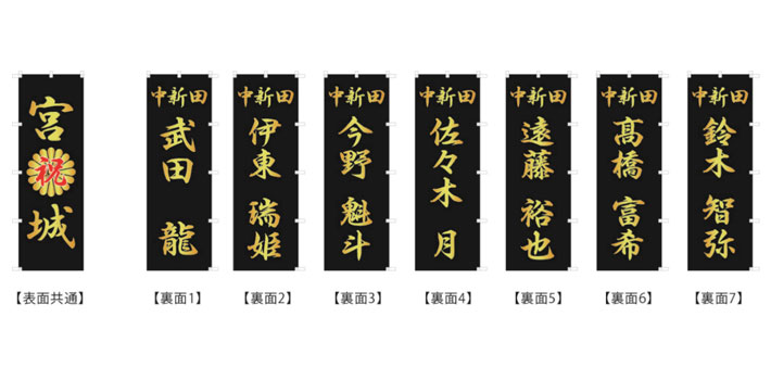 表面は共通デザイン、裏面にお名前が入ったこちらのデザインから、7種類ののぼり旗の名入れ製作を行いました。