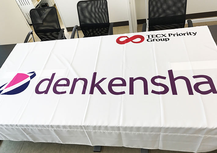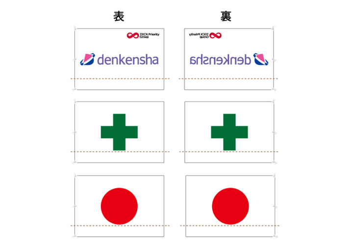 | 色指定 | 社旗:denkenshaロゴ/色見本合わせ(名刺)、安全旗:緑十字/安全緑、その他/CMYKデータ通り |