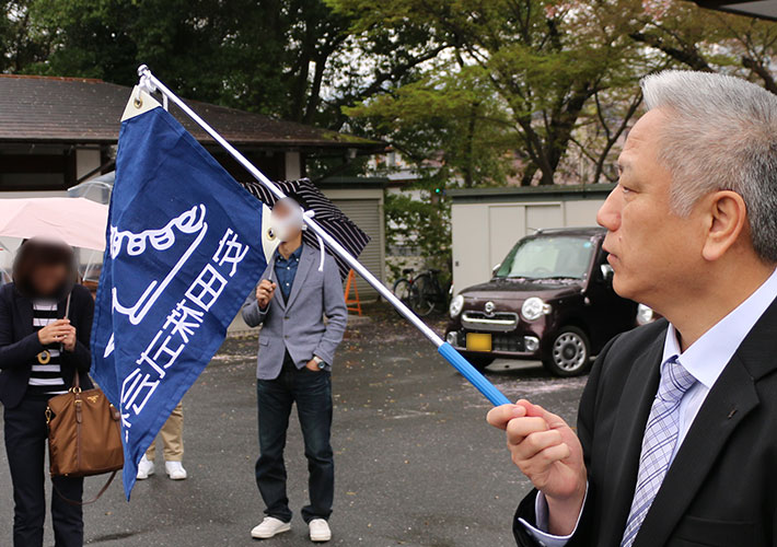 また、表裏両面から補強する挟みレザーハトメを左辺に付けることで、安定感のある手旗となりました。