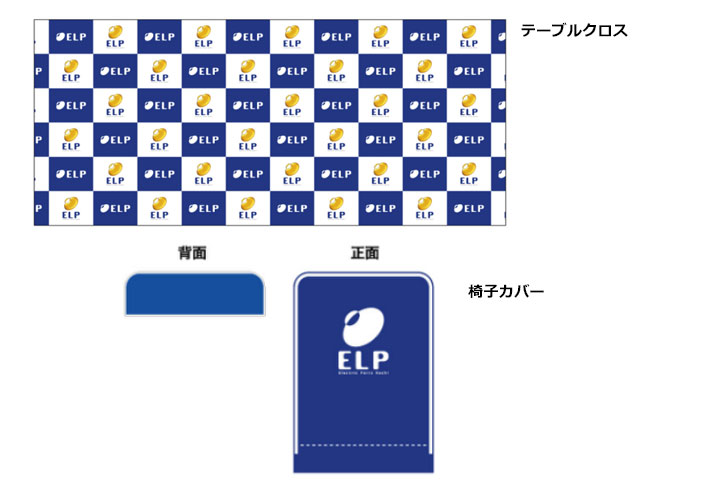 テーブルクロスは会社ロゴを散りばめた市松柄、椅子カバーは中央にロゴ入れを行ったシンプルなデザインで、それぞれ名入れ制作を行いました。