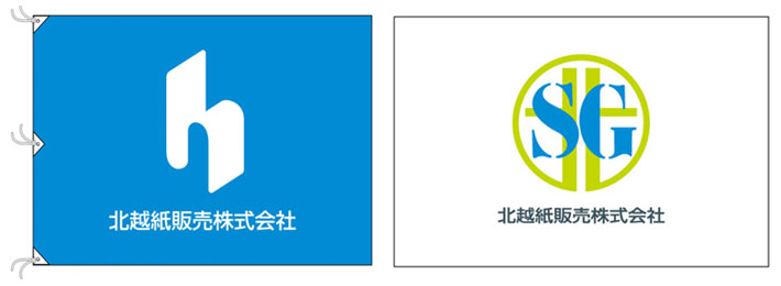 白地・青地にそれぞれロゴ入れを行ったこちらのデザインから、2種類の社旗を名入れ制作いたしました。
