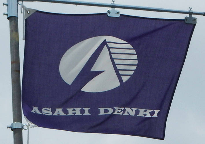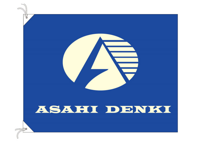 反応染めにて全面をしっかり染めあげているため色落ちもしにくい社旗です。会社ロゴがしっかり目立っていますね!