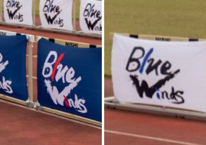 四隅に丈夫な挟みレザーハトメ加工を行い、陸上ハードルに取り付けてご活用頂いております。