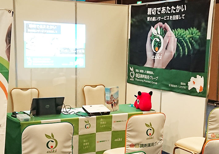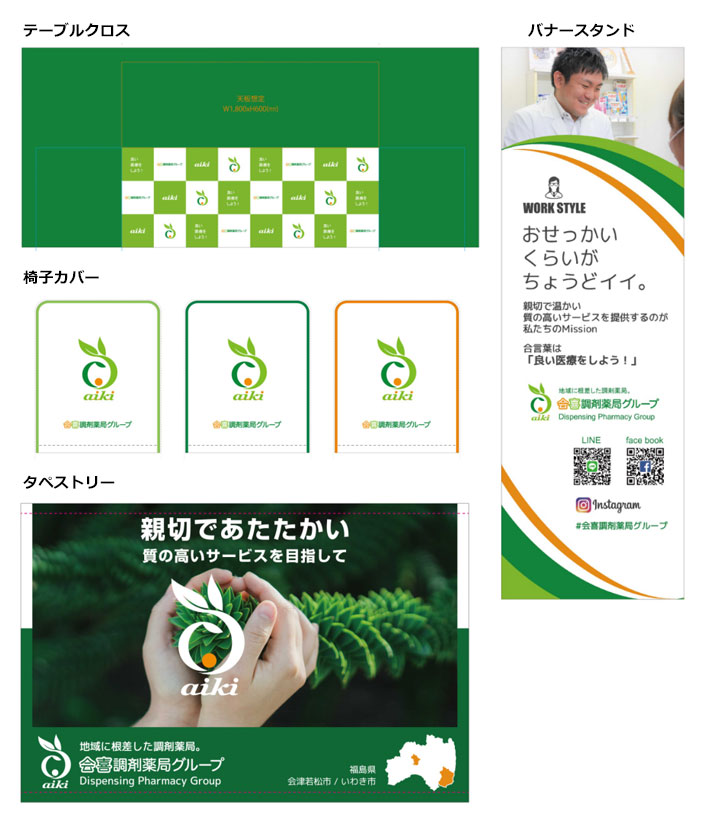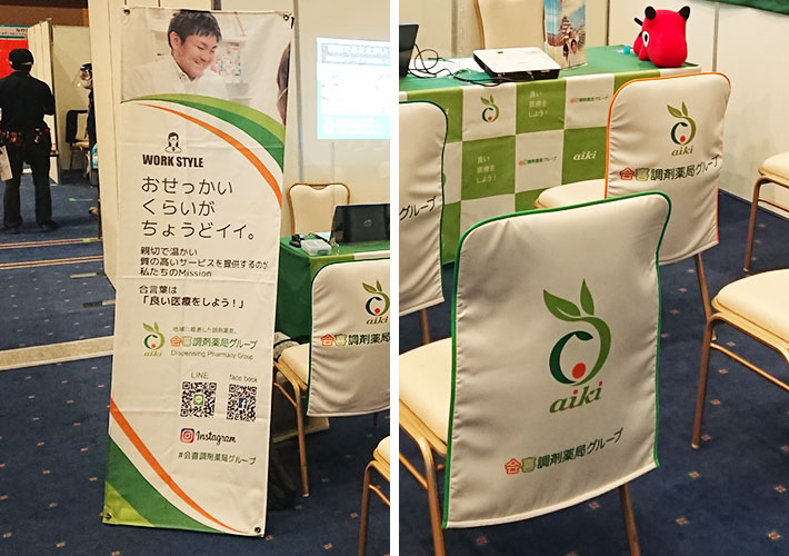【事例381】調剤薬局様の説明会ブース用テーブルクロス、タペストリー、椅子カバー、バナースタンドを製作いたしました