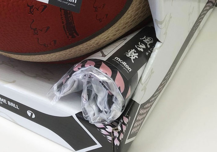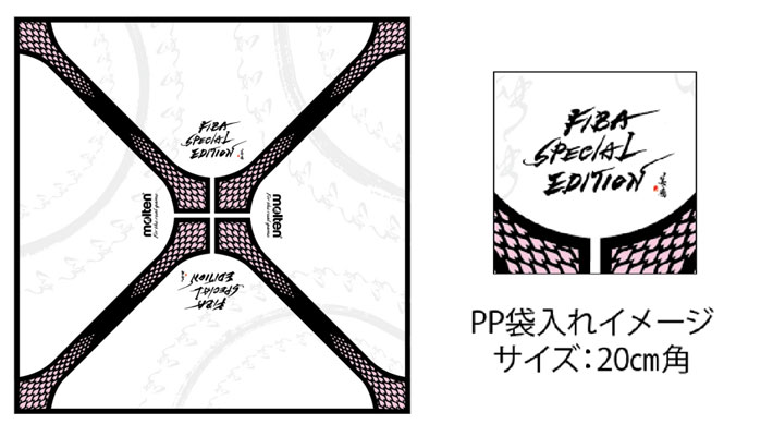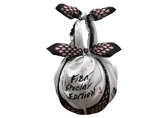 バスケットボールを包むのにぴったりなサイズ・デザインの風呂敷となり、結ぶとロゴが良く目立つ仕上がりです。