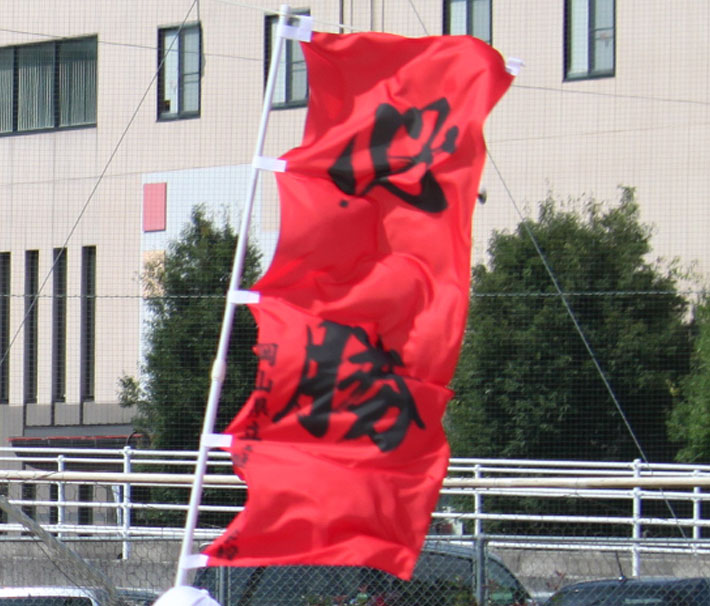 生地は定番の薄手生地となるテトロンポンジを使用しています。店舗の屋外装飾によく活用されるのぼり旗ですが、今回のような高校様の応援旗などの格安製作にもお薦めです。