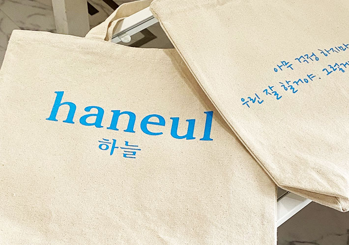 ナチュラルカラーのキャンバスバッグに、爽やかな水色でロゴを印刷いたしました。