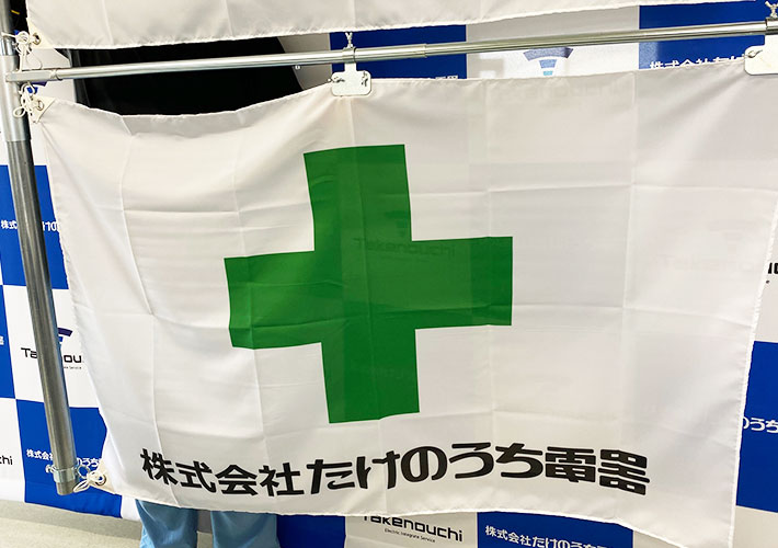 緑十字が入った安全旗は既製品のご注文も可能ですが、今回のように会社名を特注名入れすることで訴求力がUP致しますので、オリジナル作成もお薦めしております。