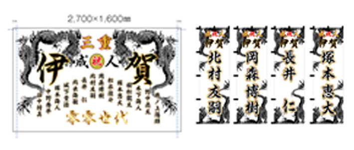 竜が描かれた背景にお名前や地名が入ったデザインから、それぞれの名入れ制作を行いました。