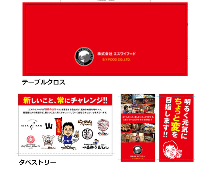 防炎トロマット生地に全面印刷を施し、正面にロゴと会社名が入ったテーブルクロスを制作いたしました。