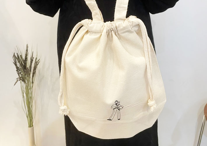 口元がキュッと締まる巾着タイプのコットンバッグに、シルク印刷にて1色名入れを施しました。