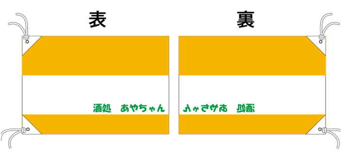 店舗名が入ったこちらのデザインから名入れ制作を施しました。左辺にハトメを付ける横長サイズとなり、裏面には反転柄をプリントします。