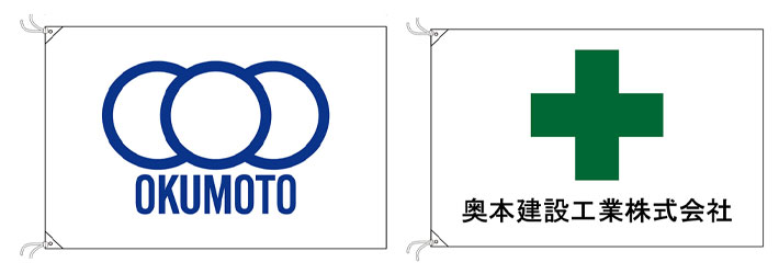 白地にブルーの会社ロゴが入ったデザインと緑十字に会社名が入ったデザインから、社旗・安全旗の名入れ制作を行いました。