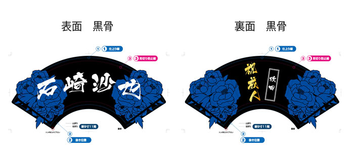 黒地に青い花柄が描かれた背面に白文字でお名前が入った、クールな印象のオリジナル扇子を製作いたしました。