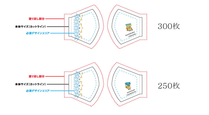 国旗を持ったキャラクターイラストやロゴ、柄模様などが入ったこちらのデザインから、2種類のマスクの名入れ制作を行いました。
