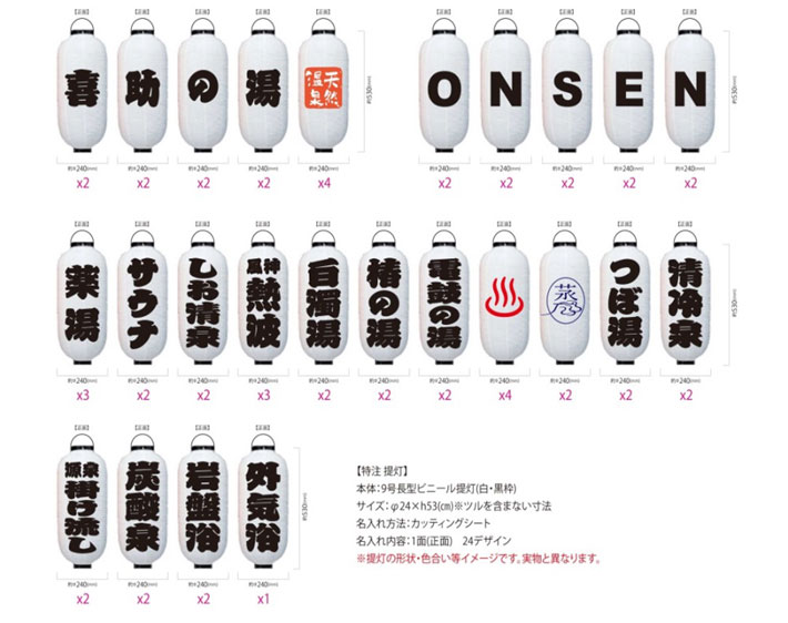 店名や温泉の種類、ロゴなどの24デザインからそれぞれ名入れ制作いたしました。