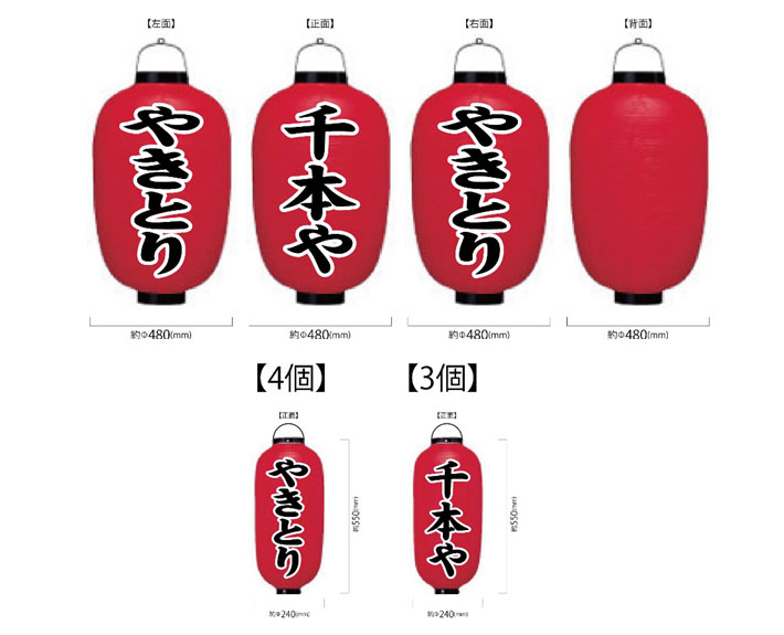 | 名入れ | 1面 正面/やきとり【4個】 正面/千本や【3個】 計7個 ※スミ文字+白フチ |