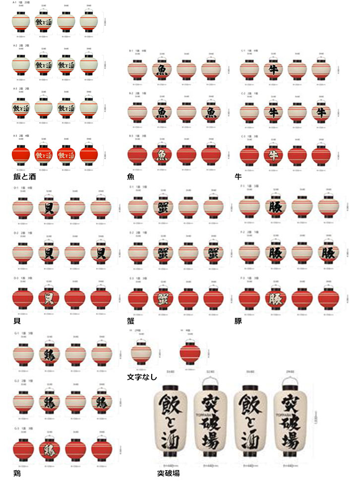 丸型提灯は上記の複数の名入れデザインにて製作いたしました。白地に赤ライン、または赤地に白ラインが入っています。