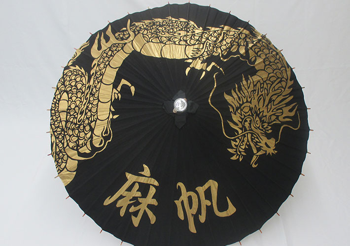 白無地の和傘に黒色でベタ塗りを行い、金色のドラゴンとお名前を手書きで名入れしております。