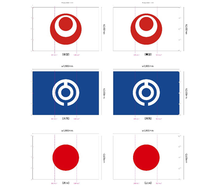 県や市のロゴが入った団体旗と、日の丸が入った国旗の3種デザインにて名入れ制作いたしました。