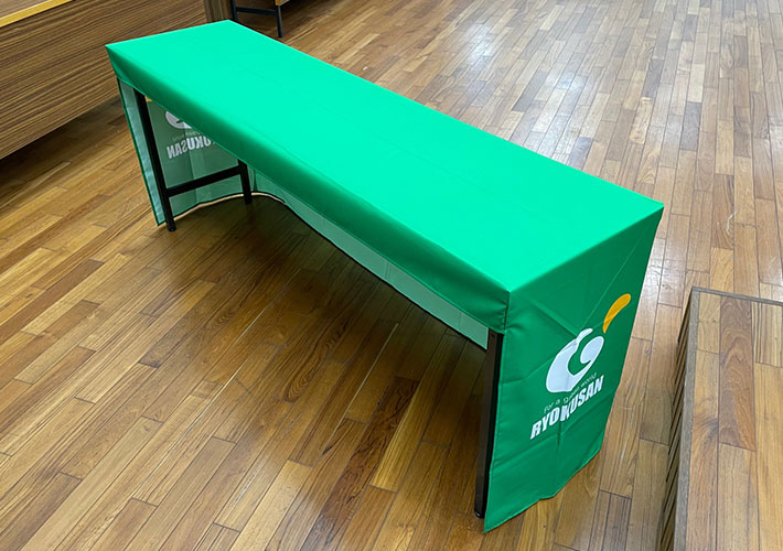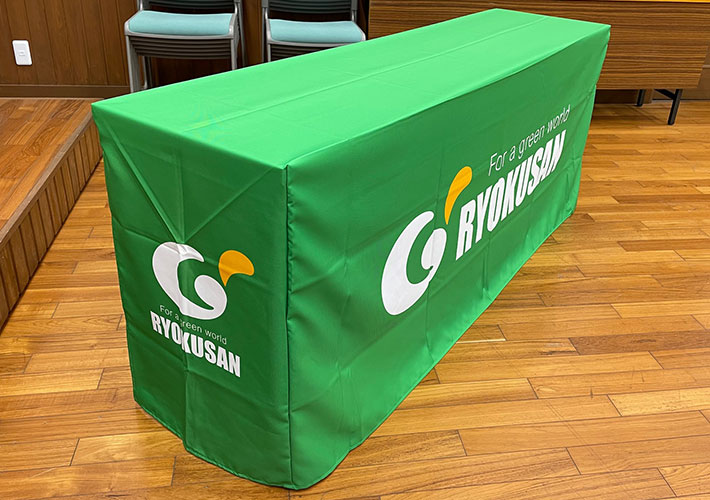 ボックス型のテーブルクロスはデザインが全面しっかり見えるので、今回のような側面へのロゴ入れには特にお薦めとなっております。