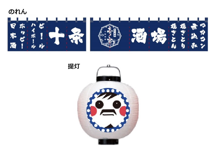 のれんは紺色のベタ地に白色で店舗ロゴやメニュー名が入ったデザイン、提灯は顔のイラストが入ったユニークなデザインで名入れ制作を行いました。