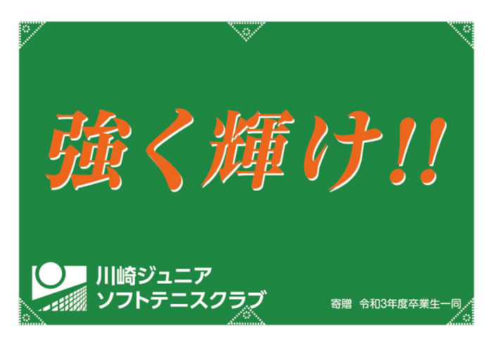 緑色のベタ地に応援メッセージやクラブ様のロゴが入った、こちらのデザインから名入れ制作を行いました。
