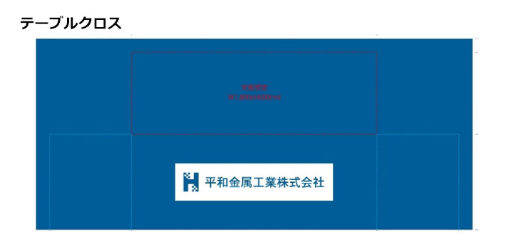 テーブルクロスは正面に会社ロゴを入れたシンプルな青地デザイン、タペストリーは全面にイメージ写真を使用したデザインで名入れ制作を行いました。