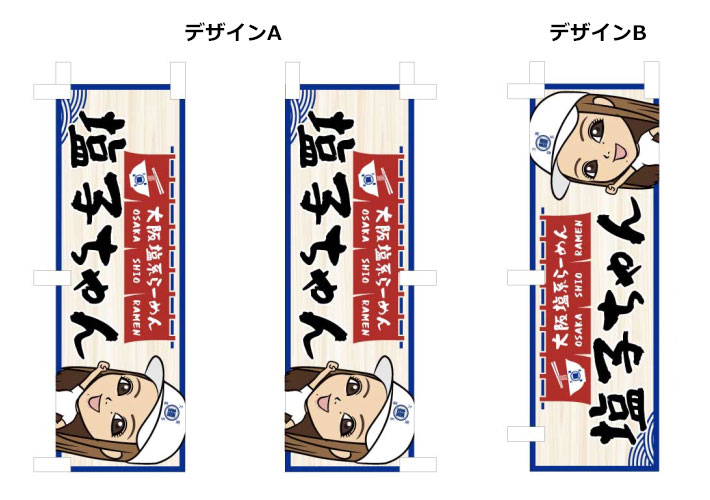 キャラクターやのれんのイラスト、店舗ロゴなどが入ったこちらのデザインから名入れ制作を行いました。