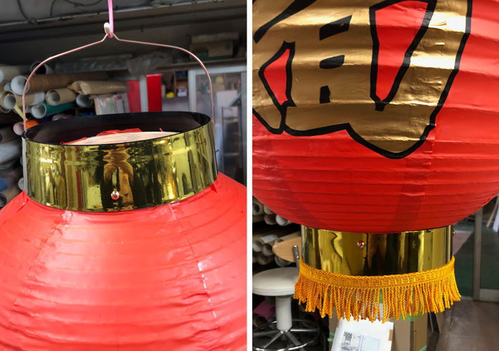 また、オプションとして上下枠にカッティングシートを貼り付けて、黒枠を金色に変更。さらに、下枠にはペナント用のフリンジテープを貼り付けすることで、豪華絢爛な装飾提灯となりました。