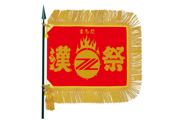 フルカラー印刷により全面の赤地プリント+金色のロゴ入れを施し、フレンジを付けて豪華な優勝旗に仕上がりました!