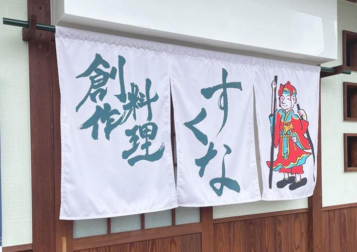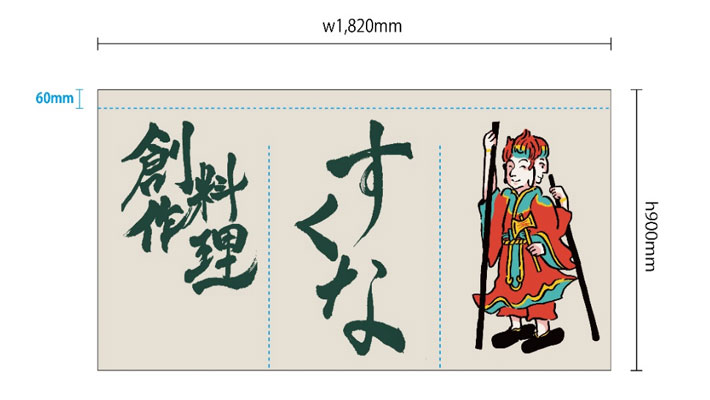 全面に昇華転写印刷を施したフルカラーのれんとなり、店舗名の落ち着いた緑色やイラストの鮮やかな赤色も綺麗に再現されています。