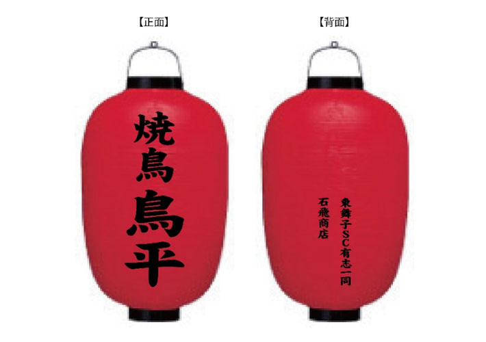 | 名入れ | 2面 正面/焼鳥 鳥平、背面/東舞子SC有志一同 石飛商店 スミ文字 |