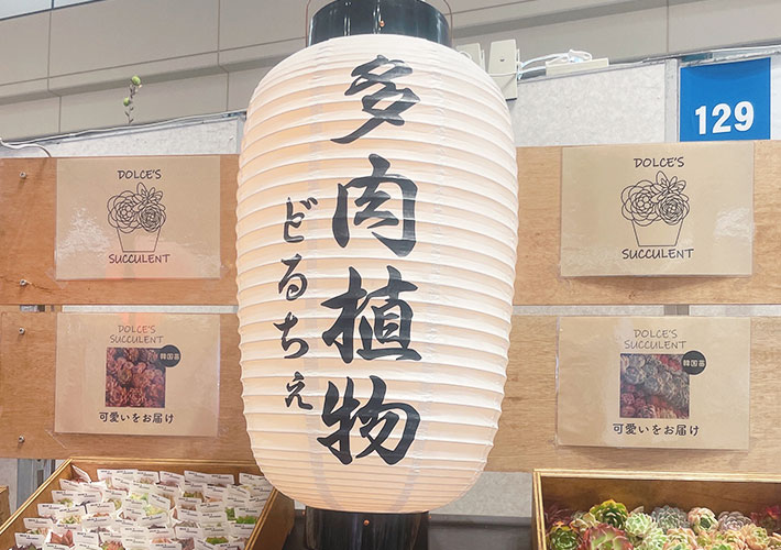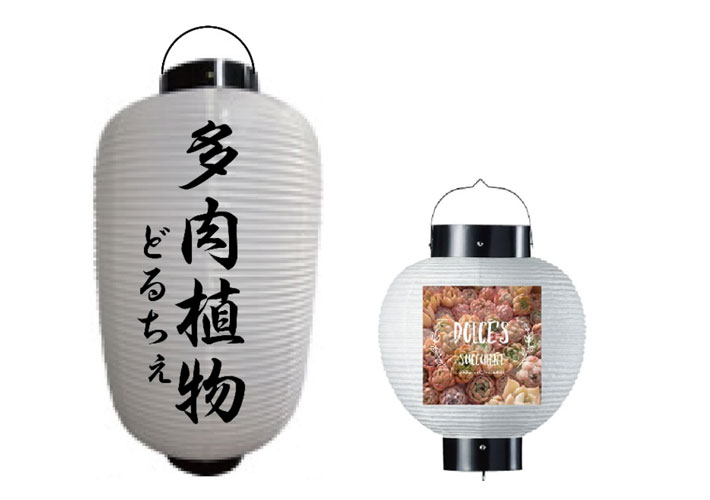長型提灯には店舗名、丸型提灯には多肉植物の写真が入ったこちらのデザインから名入れ制作を行いました。