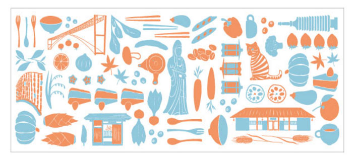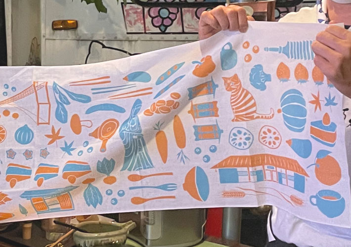 全面インクジェット加工を施し、白地にイラストが入ったおしゃれな手ぬぐいに仕上がっています。