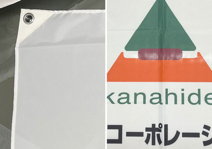 テトロンポンジ生地はのぼり旗などに使われる薄手生地となりますが、今回のようにはさみレザーハトメを施すことで掲揚して使って頂けます。