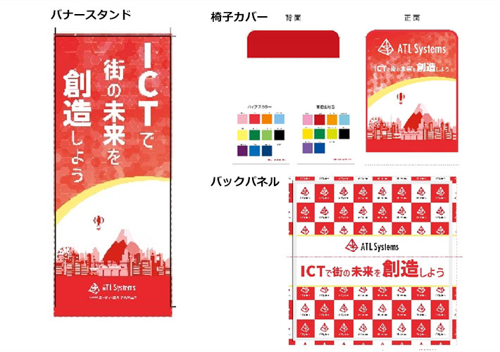 椅子カバーとバナースタンドは会社イメージデザイン、バックパネルは定番の市松模様デザインにて、それぞれ名入れ制作を行いました。