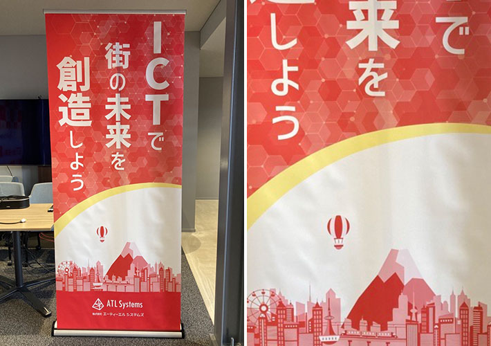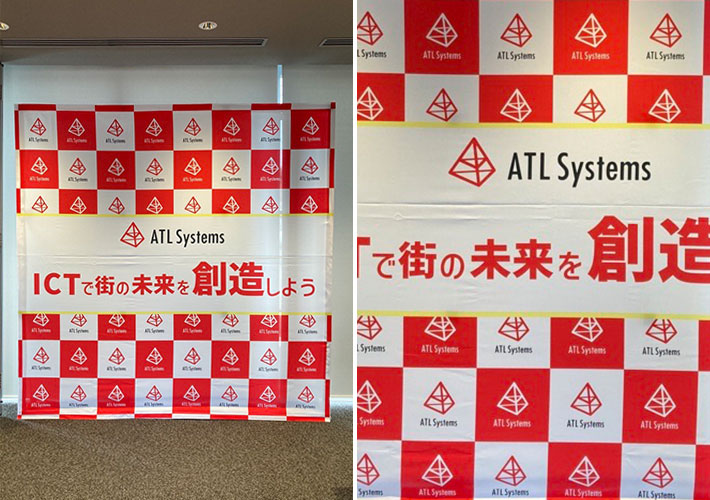 背景幕として活用しやすい市松柄はバックパネル作成において定番人気のデザインですが、今回のように中央にキャッチコピーなどを入れると、より印象的でオリジナリティのある仕上がりになりますね!
