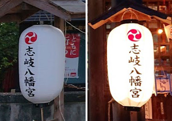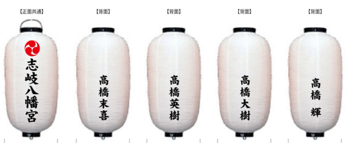 | 名入れ | 赤色(紋)+黒文字 2面 正面/三つ巴紋+志岐八幡宮 背面/奉納者名 |