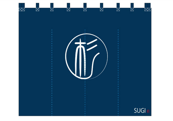紺色のベタ地のれんの中央に白色で「杉」の円形ロゴ、右下には「SUGI」の文字と落款印が入った、こちらのデザインから名入れ製作を行いました。