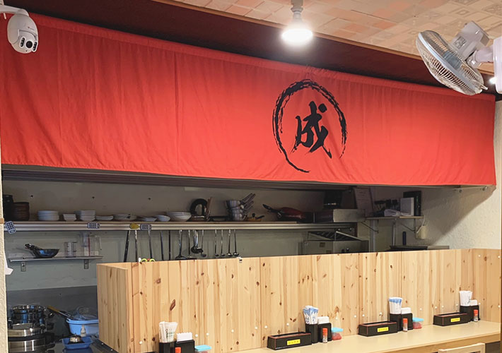 このように上部に設置する間仕切りのれんは、厨房の目隠しになりつつもオーダーを取ったり料理を提供しやすいため、ラーメン店様などに多く見受けられます。