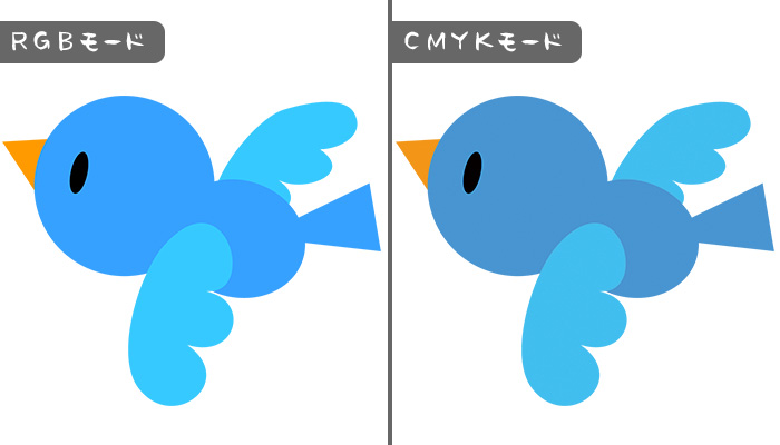 例えばこちらのRGBで描かれた水色が鮮やかな鳥さんをCMYKにすると…右側のようになります。くすんだ色になってるのがわかりますでしょうか。