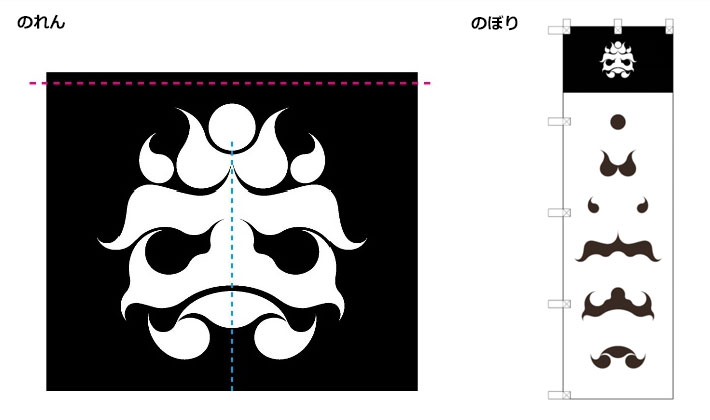 法被は衿と背中にロゴが入ったデザイン、バナー・のぼり旗・のれん・提灯は正面にロゴが入った上記デザインにて、それぞれ名入れ製作を行いました。