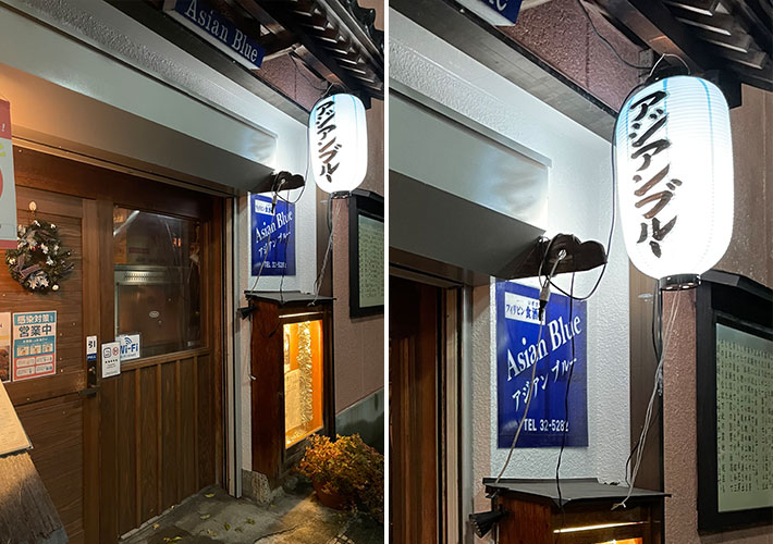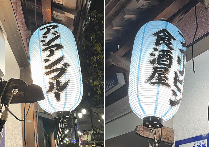 青色のビニール提灯に黒文字+白フチで店舗名の手書き名入れを施しました。