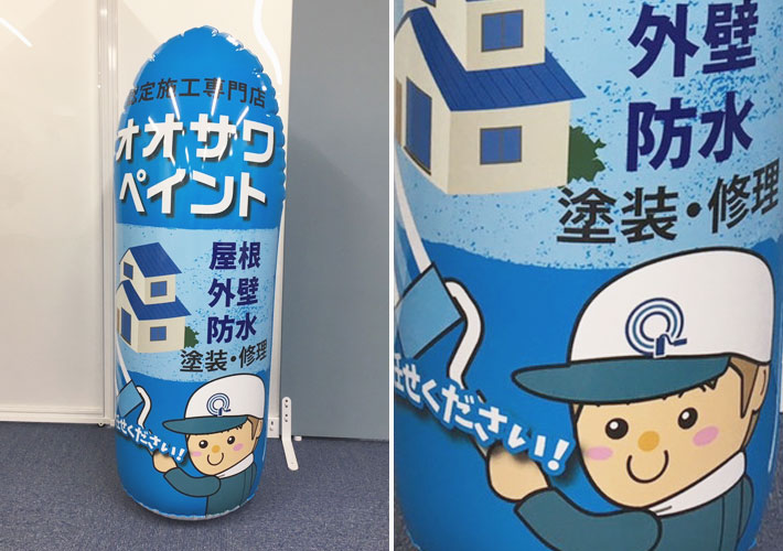 直径500×高さ1,500(mm)サイズのエアーポップバルーンに全面印刷を施し、店舗装飾としてご活用頂いております。