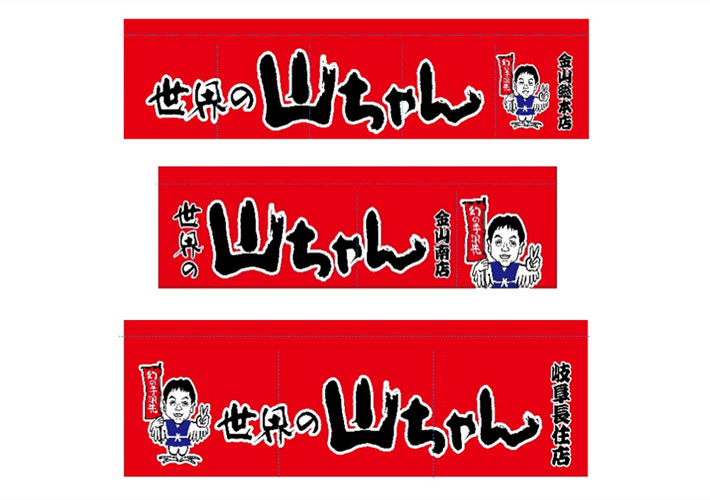 赤地に店舗ロゴやイラストが入ったこちらのデザインから、3種類ののれん製作を行いました。