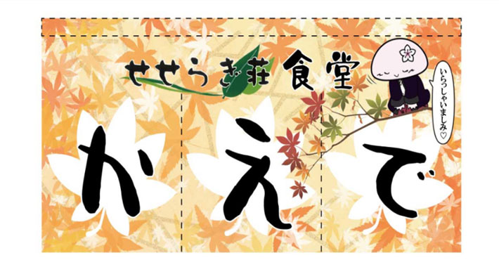 紅葉柄デザインに食堂様の店名やイラストが入った、こちらのデザインから名入れ製作を行いました。