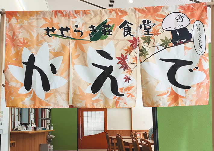 風情ある紅葉柄が全面に綺麗に印刷されています!店舗名やイラストも温かみを感じるデザインなので、ゆっくりお食事を楽しめそうな印象を与えてくれますね。