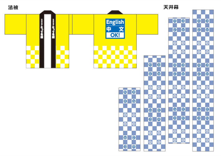法被は両襟に店舗ロゴ、背面には英語・中国語OKを伝えるロゴが入ったデザインにて、天井幕は市松柄に店舗ロゴを散りばめたデザインにて名入れ製作を行いました。