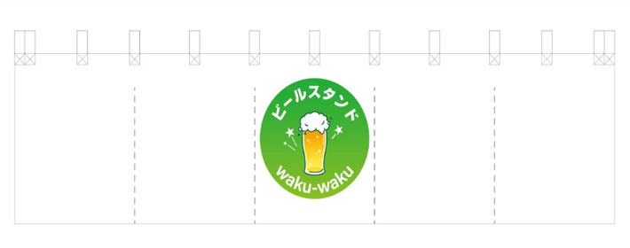 清潔感のある白地のれんの中央に丸いロゴがプリントされ、明るいグリーンとかわいいビールのイラスト入りでポップな印象です!
